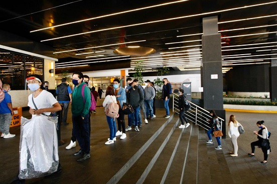 Sin guardar la sana distancia, antes de las 11 de la mañana cientos de personas realizan una larga fila para poder ingresar a la plaza comercial Parque Delta, en Benito Juárez.