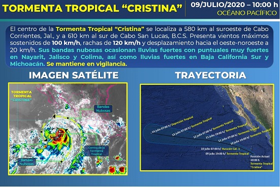El Servicio Meteorológico Nacional (SMN) prevé que este jueves la tormenta tropical Cristina se intensifique a huracán categoría 1 al sur de la Península de Baja California, ocasionando lluvias intensas en Colima y Jalisco, muy fuertes en Michoacán y Nayarit, y fuertes en Baja California Sur, así como rachas de viento de 50 a 60 km/h en el Golfo de California, además de oleaje de 2 a 3 m en las costas del sur y suroeste de Baja California Sur, Colima y Jalisco.