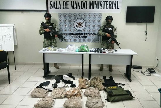 En el inmueble cateado se logró la detención de cuatro presuntos delincuentes y se aseguraron 969 envoltorios con droga, 945 tabletas de ansiolíticos, 177 cartuchos útiles de diferentes calibres, un cargador, más de 60 mil pesos mexicanos, 635 dólares, siete vehículos, 10 equipos de comunicación y equipo táctico incluyendo uniformes militares y chalecos balísticos.