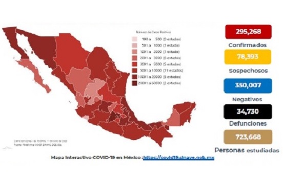 La epidemia de Covid-19 en México se mantiene al alza. El reporte difundido en Internet por la Secretaría de Salud (Ssa) señala que los contagios confirmados suman 295 mil 268 con 6 mil 94 notificados en las últimas 24 horas, que se agregan a los 6 mil 891 reportados este viernes.