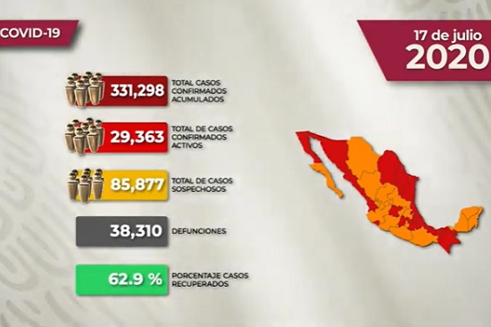 A casi 50 días del inicio de la nueva normalidad, los contagios por Covid-19 en México alcanzaron los 331 mil 298, de los cuales 7 mil 257 se reportaron en las 24 horas, mientras los fallecimientos suman 38 mil 310, con 736 casos notificados al registro acumulado de jueves a viernes. Los casos sospechosos acumulados son 85 mil 877.