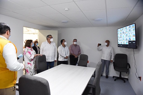 Esta imagen se ve en otro video del mismo acto oficial en la que se aprecia al gobernador López Hernández y una comitiva de acompañantes, entre ellos la secretaria de Salud, Roldán Fernández ingresando a la burbuja de atención médica, mientras un conjunto musical de marimba ambienta la inauguración del hospital provisional.