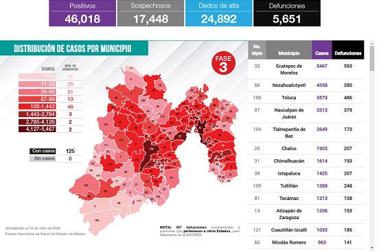 El Gobierno del Estado de México, encabezado por Alfredo Del Mazo Maza, a través de la Secretaría de Salud, informa que al corte de las 20:00 horas se contabilizan 46 mil 018 casos positivos y 17 mil 448 personas sospechosas de estar infectadas con el virus SARS-CoV-2.