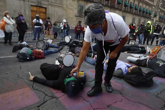 La mañana de este lunes, mujeres encapuchadas protestan afuera de las instalaciones de Palacio Nacional, donde el presidente Andrés Manuel López Obrador realizaba su conferencia matutina.