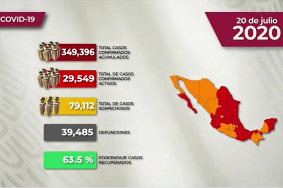 El reporte sobre el comportamiento de la pandemia de Covid-19 en México indica que se confirmaron 5 mil 172 casos en las últimas 24 horas, con lo que el acumulado llegó a 349 mil 396. También se agregaron 301 fallecimientos, para un total al día de hoy de 39 mil 485.