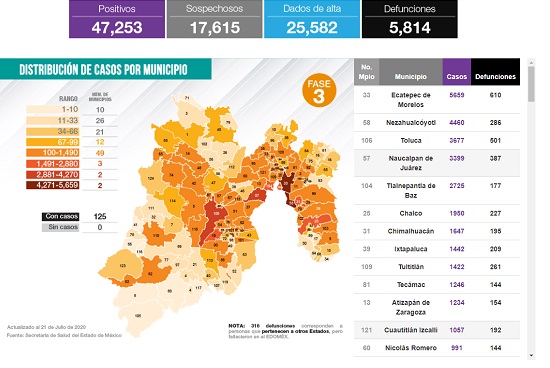 Edoméx suma 47,253 casos Covid-19 y 5,814 defunciones