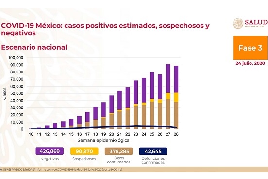 En México la epidemia de Covid-19 reportó 7 mil 573 casos nuevos en las últimas 24 horas, para un total acumulado de 378 mil 285. Los fallecimientos también se incrementaron en 737 nuevos confirmados por laboratorio de jueves a viernes, con un reporte de 42 mil 645 decesos.