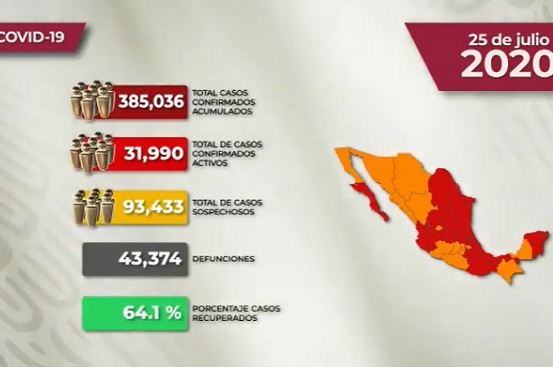 En las últimas 24 horas los nuevos casos positivos de Covid-19 se incrementaron a 6 mil 751, para un total de 385 mil 36. Los fallecimiento también continúan al alza con 729 casos reportados de viernes a sábado, y un registro acumulado de 43 mil 374.