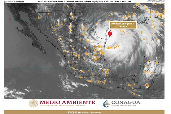 La mañana de hoy, en el Golfo de México, la tormenta tropical Hanna se intensificó a huracán de categoría 1 en la escala Saffir-Simpson, y durante las próximas horas ocasionará lluvias puntuales torrenciales en Nuevo León y Tamaulipas; intensas en regiones de Coahuila, y muy fuertes en zonas de San Luis Potosí. Asimismo, generará rachas de viento superiores a 80 kilómetros por hora (km/h) en Coahuila, Nuevo León y Tamaulipas, y oleaje de 2 a 3 metros de altura en la costa norte de Tamaulipas.