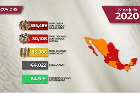 Con 14 estados de la República que esta semana se mantienen en el color naranja del semáforo, hoy se confirmaron 4 mil 973 casos de Covid-19, con lo que el registro acumulado subió a 395 mil 489. También se tuvieron los resultados de la prueba de laboratorio de 342 defunciones. Al día de hoy, 44 mil 22 personas han perdido la vida a causa de la enfermedad.
