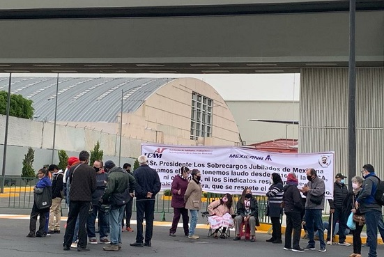 Un grupo de sobrecargos jubilados de Mexicana de Aviación se manifestaron afuera del ex Hangar Presidencial, para exigir el pago de pensiones y se respete el laudo que ya causó estado y el cual les ha dado dos embargos, entre ellos, el producto financiero que emane de la explotación de las rutas y slots de la aerolínea.