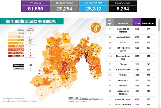 Edoméx suma 51,555 casos Covid-19 y 6,264 defunciones