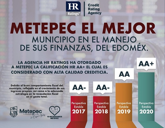 De acuerdo a la última revisión emitida por la agencia HR Ratings, la calificación otorgada a la actual administración del municipio de Metepec, pasó de HR AA a HR AA+ y mantuvo la perspectiva Estable, lo cual significa que es considerado con alta calidad crediticia, además de ofrecer gran seguridad para el pago oportuno de sus obligaciones de deuda y mantener muy bajo riesgo crediticio bajo escenarios económicos adversos.