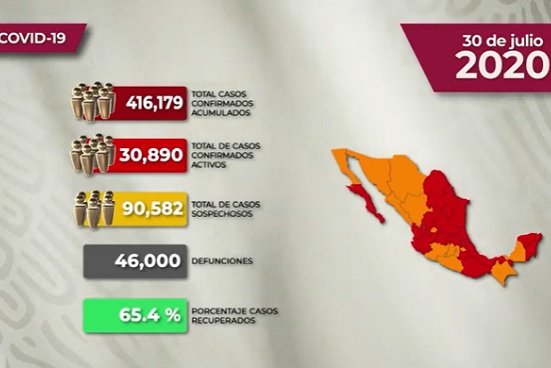 La epidemia de Covid-19 en México sigue activa. De acuerdo con los datos difundidos por la Secretaría de Salud (Ssa) el número de casos confirmados es de 416 mil 179, con 7 mil 730 nuevos casos notificados en las últimas 24 horas. Los decesos también se han incrementado. Entre miércoles y jueves se confirmaron por laboratorio 639 fallecimientos, para un reporte acumulado de 46 mil.