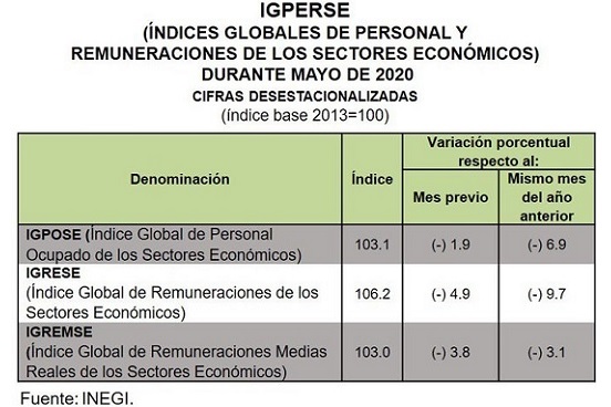 Mientras que de acuerdo con el Índice Global de Personal Ocupado de los Sectores Económicos (IGPOSE) en mayo en los sectores referidos la cantidad de personal se redujo 6.9 por ciento anual, mientras que en su variación mensual se redujo 1.9 por ciento.