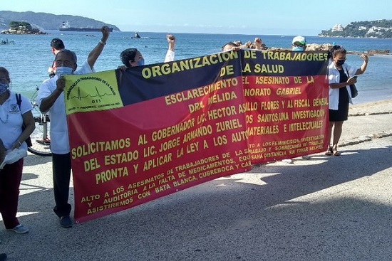 Acapulco, Gro. Médicos integrantes de la Organización Trabajadores de la Salud, se manifestaron la mañana de este sábado en el Asta Bandera, frente al parque Papagayo, para exigir el esclarecimiento del asesinato de la directora del hospital Básico de Huamuxtitlán, Mélida Honorato Gabriel, ocurrido el pasado 24 de julio, en la región de la Montaña.