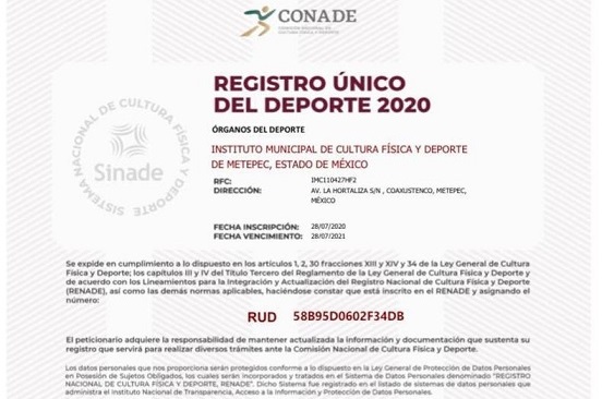 La Comisión Nacional de Cultura Física y Deporte (CONADE), renovó el Registró Único del Deporte (RUD) a Metepec, quien el año pasado obtuvo la certificación constituyéndose entonces como el primero de la entidad y este año por sus buenas prácticas fue renovado.