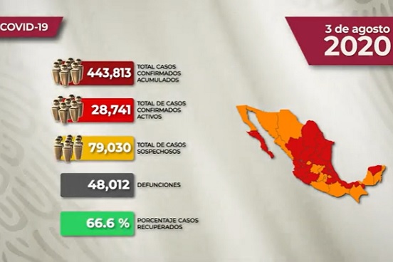 En las pasadas 24 horas se confirmaron 4 mil 767 casos con lo que el registro acumulado subió a 443 mil 813. También se agregaron 266 defunciones y la cifra global se ubicó en 48 mil 12.