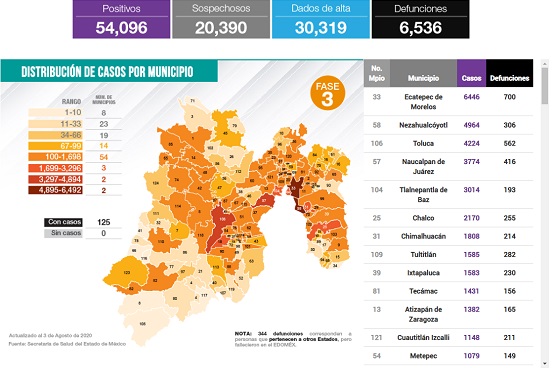 Edoméx suma 54,096 casos Covid-19 y 6,536 defunciones con 30,319 dados de alta