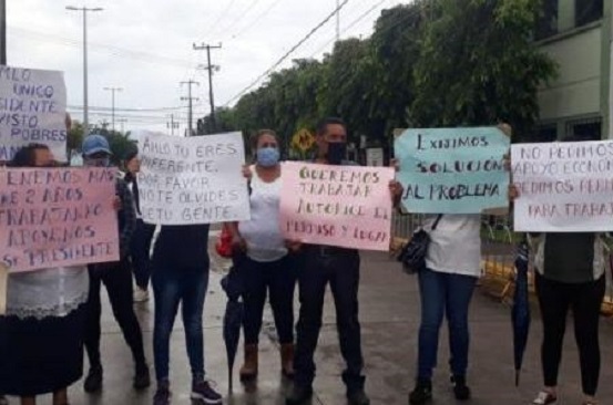 Tepic, Nay. Ex servidores, dependientes de la Secretaría de Bienestar, despedidos hace dos meses, maestros de la sección 49 y comerciantes de la zona aledaña al nuevo Issste La Cantera se manifiestaban en demanda de una solución a sus diferentes problemas en el exterior de la 13a. Zona Militar con sede en Nayarit, donde se desarrolló esta mañana la conferencia de prensa del presidente Andrés Manuel López Obrador.
