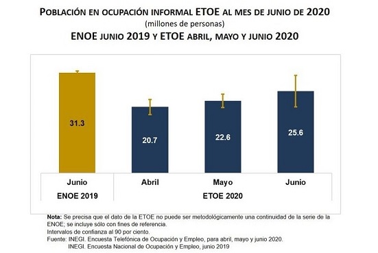 Los datos de Inegi —levantados en la Encuesta Telefónica de Ocupación y Empleo (ETOE)— exhiben que la informalidad avanza más en recuperar puestos de trabajo que otros sectores; en junio ocupó a 25.6 millones de trabajadores, de los 48.3 millones que había en el país.