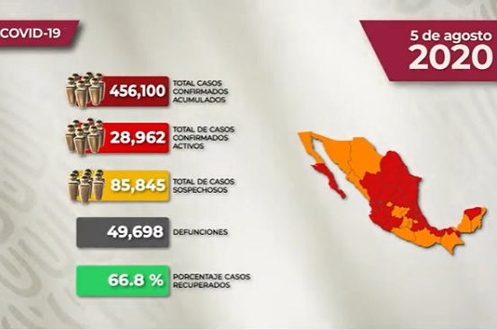 A casi 70 días del inicio de la nueva normalidad, la epidemia de Covid-19 continúa activa en prácticamente todo el territorio nacional. De acuerdo con el reporte técnico diario emitido por la Secretaría de Salud (Ssa), los contagios acumulados alcanzan los 456 mil 100, con 6 mil 139 nuevas notificaciones en las últimas 24 horas, mientras que los decesos se incrementaron en 829, para un registro total de 49 mil 698.