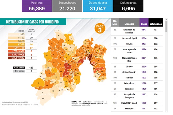 Edoméx suma 55,389 casos Covid-19 y 6,695 decesos con 31,047 dados de alta