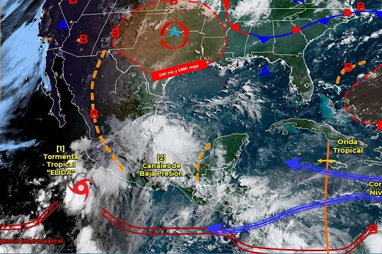 Este domingo, la tormenta tropical Elida, localizada al sur de las costas de Colima y Michoacán, en interacción con un canal de baja presión extendido sobre el noroeste, occidente y centro de la República Mexicana, ocasionará lluvias puntuales intensas (de 75 a 150 milímetros [mm]), descargas eléctricas, rachas de viento de 50 a 60 kilómetros por hora (km/h) y posibles granizadas en Jalisco y Nayarit.