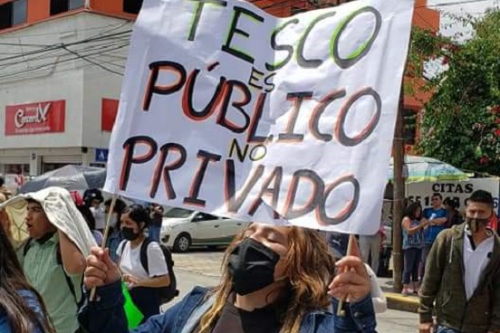 Con cartulinas en mano que señalaban “TESCO es público no privado”, “TESCO unido por cuotas justas”, “por futuros ingenieros cuotas 0”, los estudiantes de todas las carreras que se imparten en este instituto llegaron de manera pacífica al palacio de Gobierno de Coacalco y realizaron una manifestación y posteriormente entregaron un pliego petitorio.