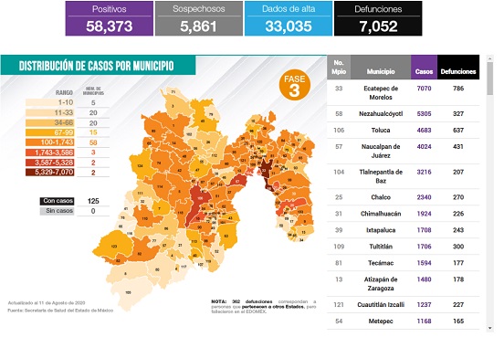 También notifica un total de 58 mil 373 casos positivos, 21 mil 979 sospechosos, 63 mil 779 negativos y el deceso lamentable de 7 mil 052 personas en territorio mexiquense, además de mil 846 en otras partes de la República mexicana.