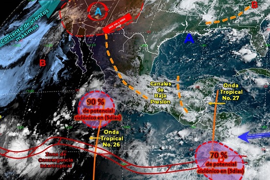 Mientras, el ingreso de la Onda Tropical Número 27 incrementará la probabilidad de lluvias fuertes en Campeche, Quintana Roo y Yucatán.