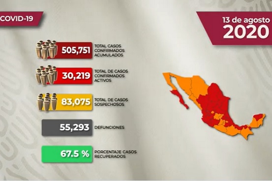 La epidemia de Covid-19 en México sigue en aumento. El reporte técnico diario emitido por la Secretaría de Salud (Ssa) informa que los contagios acumulados son 505 mil 751, con 7 mil 371 casos notificados en las últimas 24 horas. En cuanto al registro acumulado de fallecimiento, la cifra es de 55 mil 293, con 627 confirmadas por laboratorio de miércoles a jueves.