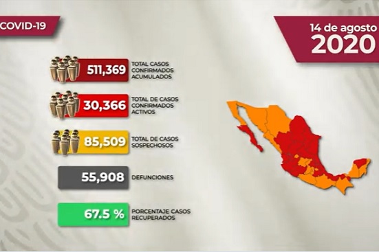 El reporte de fallecimientos acumulados confirmados por laboratorio alcanza los 55 mil 908, con 615 nuevos casos confirmados en las últimas 24 horas. Los casos sospechosos suman 85 mil 509, mientras que del millón 156 mil 852 personas estudiadas, 559 mil 974 han obtenido un resultado negativo. Por lo que respecta a la población recuperada suman 345 mil 653.