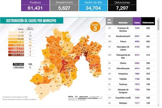 También se contabilizan un total de 61 mil 431 casos positivos, 21 mil 837 sospechosos, 68 mil 485 negativos, mil 544 pacientes reciben atención en hospitales de la entidad y otros mil 443 en nosocomios de otros estados, también se lamenta el fallecimiento de 7 mil 297 personas, cuyos decesos ocurrieron el Estado de México y otros mil 914 en otras regiones de la República mexicana.