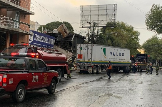 El vehículo de doble remolque transportaba maíz cuando se impactó con el vehículo y dos inmuebles en la colonia Independencia.