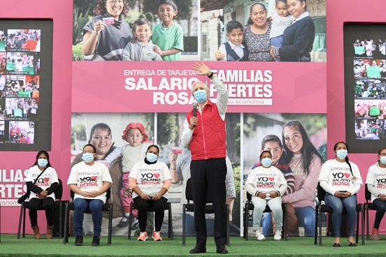 El Gobernador Alfredo Del Mazo Maza indicó que el Salario rosa apoya a la economía de las familias mexiquenses, la cual se ha visto afectada por la pandemia por COVID-19, y reiteró que este programa es para las mujeres porque son ellas quienes saben invertir cada peso que llega a sus hogares e, incluso, lo multiplican, para que rinda más.