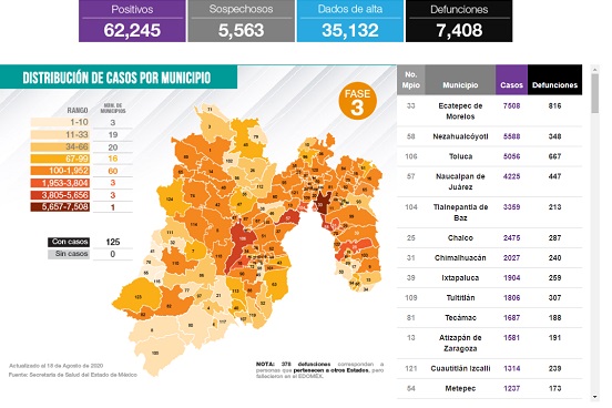 Edoméx suma 62,245 casos Covid-19 y 7,408 defunciones