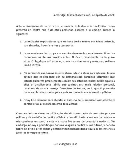 Ante la divulgación de un texto que, al parecer, es la denuncia que Emilio Lozoya presentó en contra mía y de otras personas, expreso aquí mis comentarios.