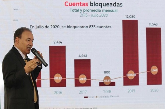 En tanto que respecto a la incidencia de delitos del fuero federal al comparar las cifras absolutas de enero a julio de 2020 con 2019, explicó que la delincuencia organizada subió 59 por ciento, pero bajó en – 52 por ciento el robo de hidrocarburos; en – 39 por ciento los delitos financieros; en – 60 por ciento los delitos migratorios; en – 13 por ciento los delitos contra la salud y en – 27 por ciento en la cifra total de delitos federales.