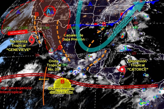 La tormenta tropical Genevieve continuará su desplazamiento paralelo a la costa occidental de Baja California Sur. Originará lluvias puntuales fuertes, y rachas de viento de 70 a 80 km/h en la Península de Baja California, así como oleaje de 3 a 5 m de altura en su costa occidental, y de 2 a 3 m de altura en el Mar de Cortés, informó el Servicio Meteorológico Nacional (SMN).