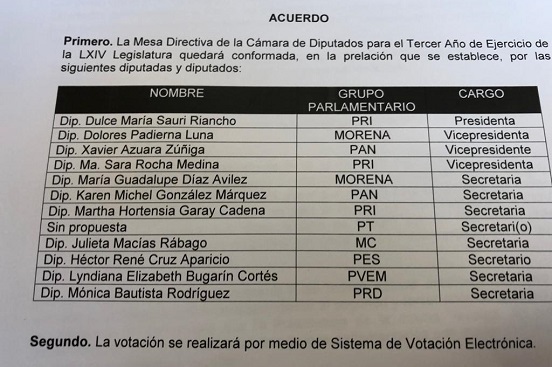 En ese contexto y a propuesta de cada grupo parlamentario, la propuesta –que deberá ser votada esta tarde por el Pleno de la Cámara y obtener las dos terceras partes de la votación para su aprobación- la integran: Dulce María Sauri Riancho para presidenta; como vice presidentes las propuestas son Dolores Padierna de Morena; Xavier Azuara Zúñiga del PAN; y Sara Rocha Medina del PRI. En tanto las secretarías recaerán en María Guadalupe Díaz; Karen Michel González del PAN; Martha Hortensia Garay del PRI; Julieta Macías de MC; Héctor René Cruz del PES; Elizabeth Bugarín Cortés del PVEM y Mónica Bautista Rodríguez del PRD.