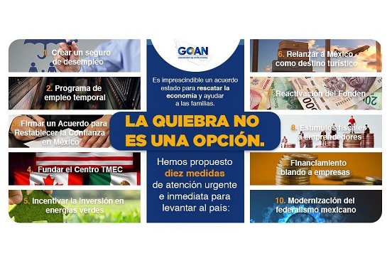 A través de su cuenta de Twitter, la GOAN señaló que se debe crear un seguro de desempleo, así como un programa de empleo temporal. Además se debe firmar un acuerdo para restablecer la confianza en México.