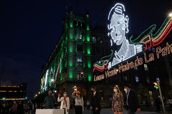 «Iluminan el Zócalo de la ciudad héroes de la lucha por de Independencia, Hidalgo, Morelos, Josefa Ortiz de Dominguez, Ignacio Allende, Vicente Guerrero y Leona Vicaria, hoy quiero destacar dos símbolos patrios, la primera es precisamente Leona Vicario, quien sacrificó su vida y posición social por la construcción de una nación libre y soberana”, indicó Sheinbaum Pardo.
