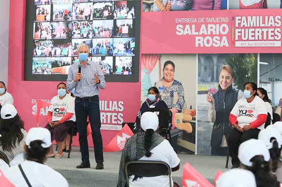 Señaló que por la pandemia por COVID-19 no se pueden realizar eventos masivos, sin embargo, cuidando la salud de las beneficiarias de este programa, se entregan las tarjetas en planteles educativos y en casas, siempre cuidando las medidas de sanidad, esto con la finalidad de que Salario rosa siga llegando a los hogares que más lo necesitan.