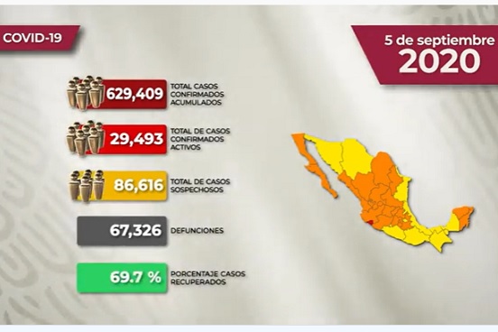 Ricardo Cortés, director general de Promoción de la Salud, informó que los contagios confirmados de Covid-19 en México suman 629 mil 409, con 6 mil 319 nuevas casos en las últimas 24 horas, mientras que los decesos aumentaron en 475, para un registro acumulado de 67 mil 326.