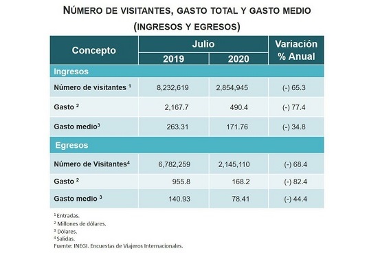 Inegi detalló que en julio el número de visitantes se redujo 65.3 por ciento, respecto a 2019; además el gasto total se redujo 77.4 por ciento y el gasto medio de cada turista lo hizo 34.8 por ciento.