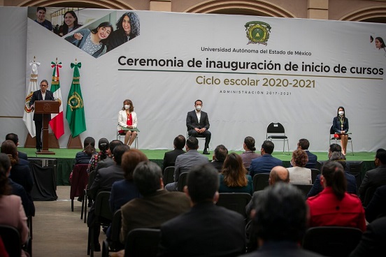 El rector de la Universidad Autónoma del Estado de México, Alfredo Barrera Baca, encabezó la ceremonia de inauguración del Ciclo Escolar 2020-2021, que esta casa de estudios inicia con 91 mil 876 estudiantes, tres mil más con respecto al periodo anterior.