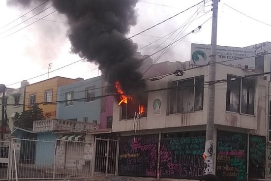 Luego de que fueron liberadas del centro de justicia de Atizapán de Zaragoza, donde había sido trasladadas por agentes ministeriales por haber tomado las instalaciones de Derechos Humanos de Ecatepec, mujeres feministas regresaron a estas instalaciones y causaron destrozos e incendiaron la parte alta del inmueble.