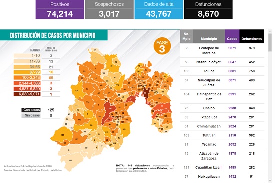 Edoméx suma 74,214 casos Covid-19 y 8,670 decesos con 43,767 dados de alta