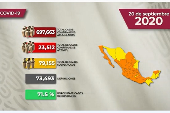 La Secretaría de Salud informó que los casos confirmados de Covid-19 este domingo suman 697 mil 663 con 3 mil 542 notificados entre sábado y domingo, una vez que el sábado fueron 694 mil 121. Mientras que los decesos se incrementaron en 235 para llegar a un total de 73 mil 493 muertes confirmadas por pruebas de laboratorio.